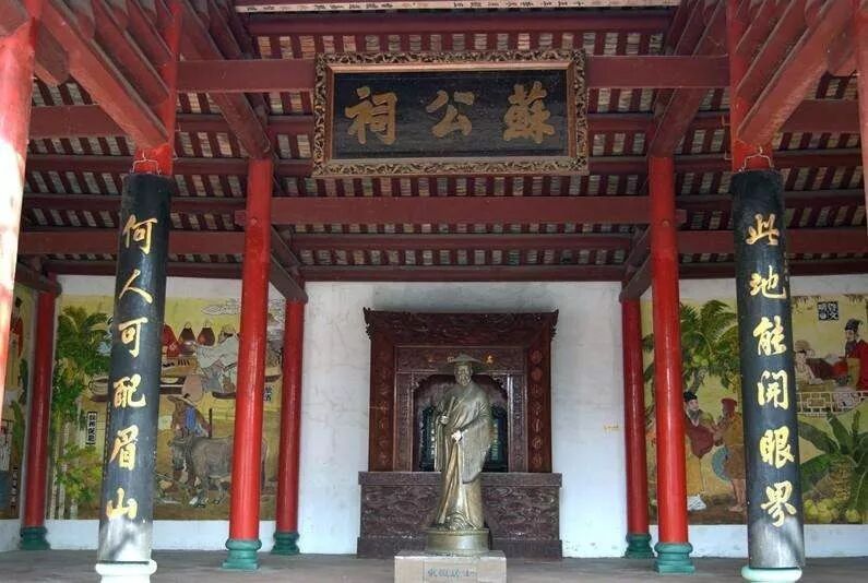 第三句:“此地能开眼界,何人可配眉山”。这句诗来自于海南琼山苏公祠。苏公祠内这副天下名联,意蕴丰富,道出了琼州人民对苏公的景仰之情。