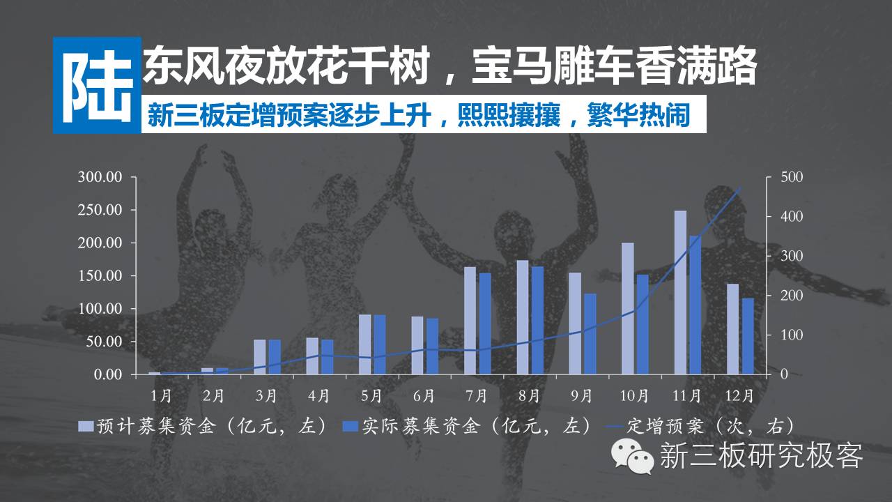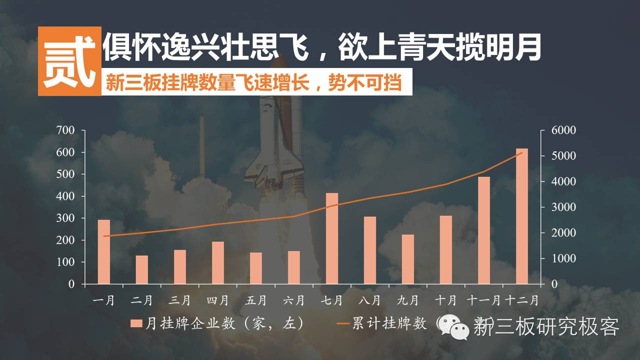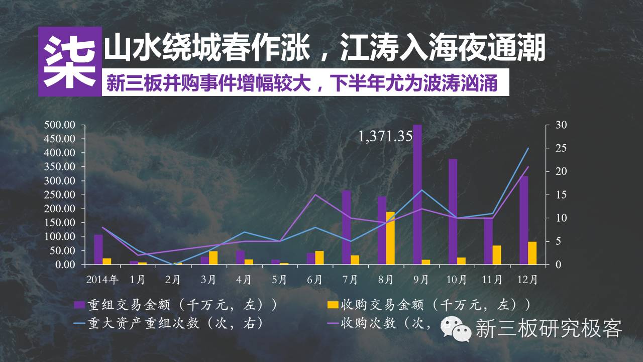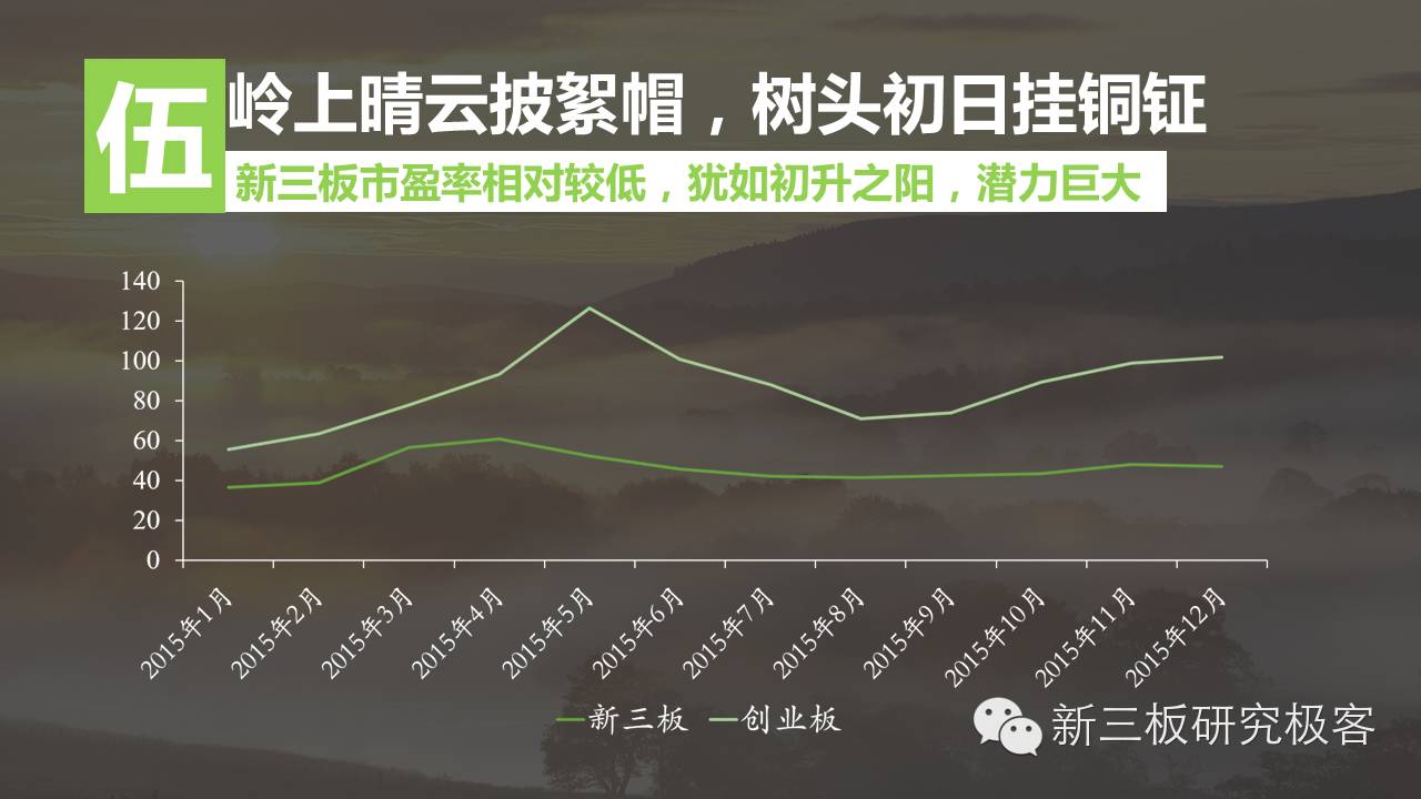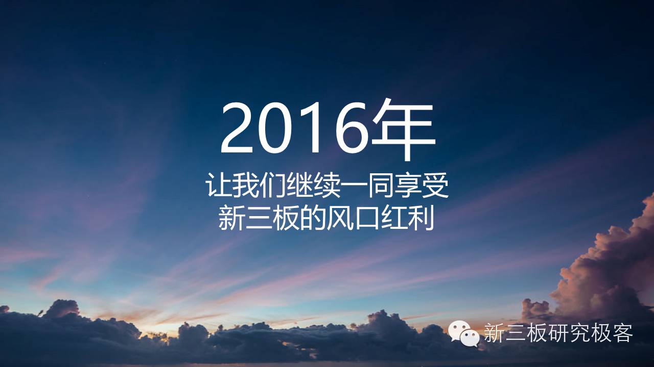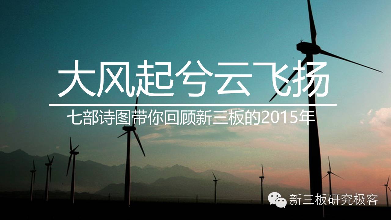 约1800年前,。冉冉岁月流去,在2016初来之际,广证恒生借先人之智,集今人之识,汇成七部诗图,让我们一同回顾新三板精彩纷呈的2015。新三板2015年真所谓大风起兮云飞扬,证监会、股转系统3月份发布两大指数,9月份发布优先股业务指引,11月发布分层方案、明晰未来发展,建设之快、前景之明让世人为之期待!2015年是中国资本市场风起云涌的一年,新三板指数先在3、4月份快速上涨,达到顶峰后持续回落,在经历了数月的沉寂与反复探底后,终于在年末重新开启了抬头之势,激动人心的十连阳昭示着新三板底部的初成。2015年以来,新三板挂牌企业数量不断上升,下半年开始明显提速,11月和12月挂牌速度为全年最高,12月份甚至达到了一个月超过600家的挂牌速度,平均一天就有25家企业挂牌!新三板已经成为目前我国最大的证券市场!新三板累计挂牌企业从0到1000家耗费了2236个工作日,从1000-2000家花了144个工作日,从2000-3000家用了106个工作日,从3000-4000家用了73个工作日,而最新增加的1000家,仅用了35天的工作日!新三板企业挂牌速度越来越快!、证监会、股转系统轮番发话要增加新三板挂牌数,总家数突破6000,乃至10000大关的速度或将更快。相比2014年,今年上半年新三板交易活跃度大幅提升。广证恒生认为经过年中数月的筑底,新三板市场底部基本形成,国内流动性宽松大环境、A股赚钱效应和政策红利将给新三板带来积极影响,有利于交投的持续改善。但流动性问题的解决是个长期过程,而且最终也将呈现结构性流动充裕的特征。新三板挂牌企业的市盈率(整体法、上年年报、剔除负值)与三板行情走势相关,呈现出先快速上升后回调的走势。下半年趋于平缓,稳健发展。与创业板相比仍处于低位,潜力巨大。尽管新三板火爆行情未能持续,但定增市场表现不断走好,定增的数量和规模都快速增长,新三板的定增融资功逐步得到体现。虽然近几个月受市场深度回调期影响,定增市场的融资规模增速有所放缓,但鉴于近期利好政策逐步兑现,广证恒生认为近期新三板定增市场的相对放缓不改变长期趋势,无论是政策方面还是企业需求方面,进一步发挥新三板的融资功能已成共识。2015年新三板重大资产重组次数为102次,重组交易总金额289.313亿元;收购次数为106次,收购交易总金额为 55.10亿元。相比2014年有较大突破,下半年突破明显。新三板并购重组大时代已经来临!七部诗图,涵盖指数走势、挂牌数、挂牌增速、交易情况、市盈率、定增融资、并购重组,虽有不全但亦可与人粗窥2015新三板波澜壮阔的成长历程。2016年,新三板的强风必将继续,广证恒生祝各位新年快乐,也祝各位好风凭借力,送我上青云!让我们一同享受新三板的风口红利!![]()