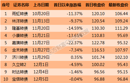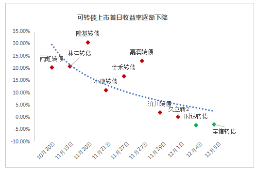东方财富Choice数据显示,自11月29日济川转债上市以来,连续4只可转债首日涨幅低于2%,这与此前6只可转债首日平均收益率约20.2%的情况形成巨大反差。不过,收益率直线下降还不是最糟糕的,本周上市的时达转债和宝信转债甚至出现跌破面值的情况,“破发”令打新已无收益可言。