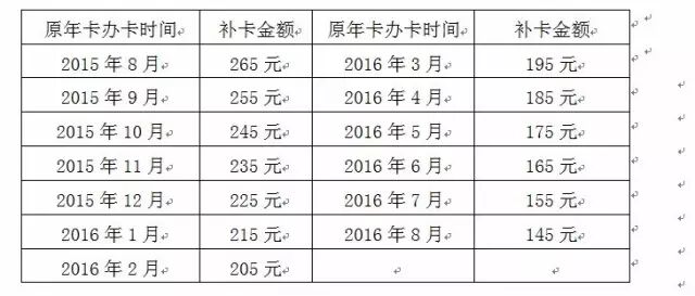 2、现年卡持有者可补差价换成新卡:(优惠时间至2016年9月1日办理,9月1日后按365元/张补差价)