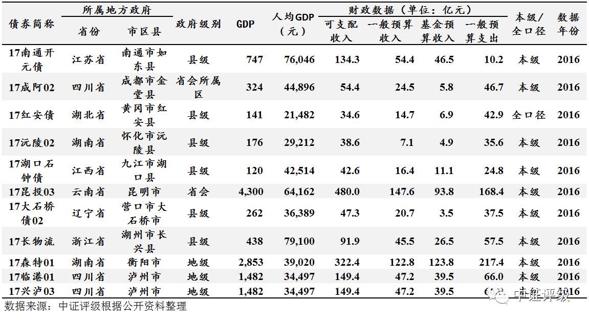 中证评级为AA-pi的6家企业中,昆明产投(17昆投03),业务涉及土地整理、园区开发、民爆和钢材贸易等。公司经营性业务整体盈利能力较差,民爆业务收入和毛利自2015年起出现大幅下滑。另需关注的是,截至2017年6月末,公司对外担保余额为61亿元,主要被担保方盈利能力差,其中对“13云中小债”发行人之一云南天浩稀贵金属股份有限公司的担保已出现合计608万元的利息代偿,未来仍面临较大代偿风险(“13云中小债”于2019年4月到期,云浩稀贵待偿本金为4000万元)。是辽宁营口市大石桥市主要的城投平台。受辽宁省经济数据挤水分影响,大石桥市2016年GDP同比下滑10%,固定资产投资等其他指标亦大幅下滑。但近年来公司营业收入仍保持高速增长,回款较为及时,经营情况仍较稳定。近期公司余额合计约17亿元的两期存量企业债提前偿还议案均获持有人通过,未来偿债压力将进一步减小。南投公司(17长物流)是浙江湖州南太湖产业集聚区长兴分区主要的产业园区开发建设主体,实际控制人为长兴县财政局。长兴县财政实力较强,经济实力亦居湖州市下属区县第一位。但公司规模较小,且经营活动现金流表现不佳。森特投资(17森特01)是湖南衡阳市松木经开区的城投平台, 2016年8,但其受到的资产注入及财政补贴均直接来源于经开区。公司近年经营性现金呈现持续大额流出,且2016年有息债务同比增长近4.5倍,偿债压力明显上升。兴泸集团(17兴泸03)是四川泸州市主要的基建主体和国资经营平台,总资产达653亿元。除传统城投业务外,也从事天然气、水务等公用事业和担保小贷、机场运营等经营性业务。公司持有的泸州老窖(持股26%,2016年末账面价值98亿元)等优质股权为公司带来稳定投资收益,并对公司债务偿还形成较好保障。泸州临港(17临港01)为兴泸集团控股子公司,主要负责泸州长江经济开发区的基础设施建设,资产规模为102亿元。