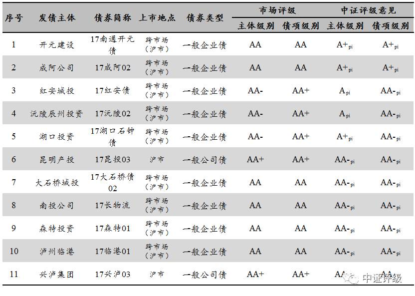 本期点评覆盖公告发行日为2017年11月20日至11月26日的城投债11只,中证主体评级为Api的有2只,A+pi和AA-pi的分别有3只和6只。