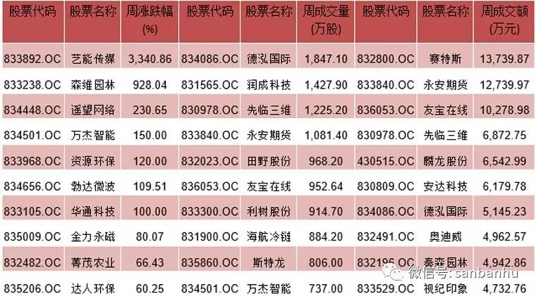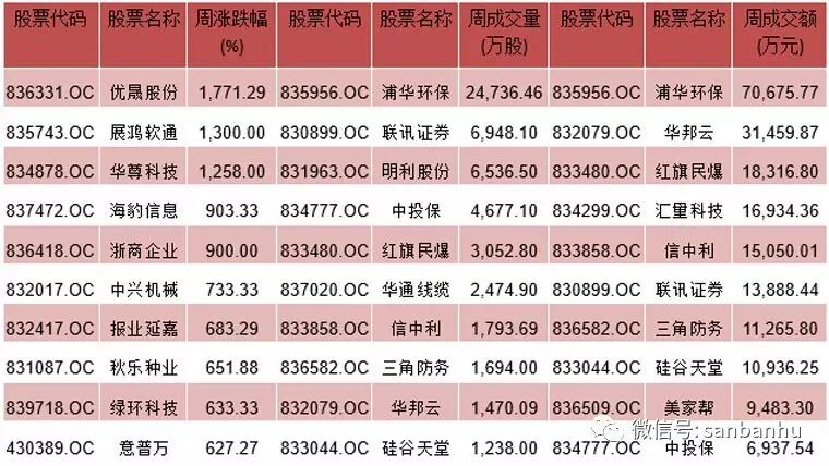 表格二:创新层周涨跌幅、周成交量、成交额前十名