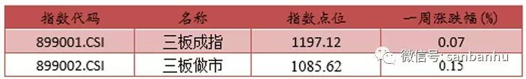 上周三板做市指数,打破四周连续下跌的阴霾终于收红,上涨1.64点,涨幅0.15%,报收1085.62点,成交额20.05亿,基本与上周持平,成交量4.24亿股,环比上涨10.4%。三板成指继续收红,微涨0.87点,涨幅0.07%,报收1197.12点,成交额49.22亿,环比上涨3.66%,成交量9.41亿股,环比上涨42%。