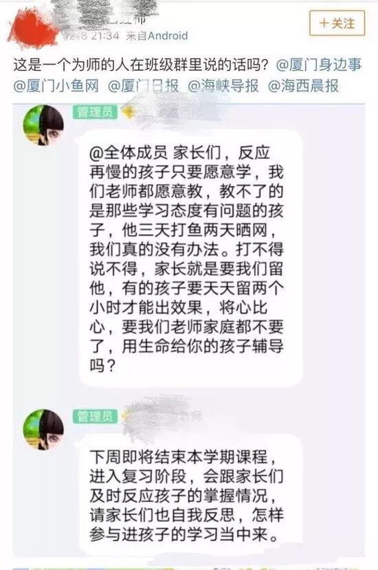 16.【老师在班群留言引家长发文怒斥 网友反为老师点赞】近日,一名厦门家长发发了一张聊天截图,截图中孩子老师说孩子学习态度有问题,而有些家长却总指望着老师留堂辅导“要老师用生命给你的孩子辅导吗?”,这位家长配字“这是一个为师的人在班级群里说的话吗?”,称看不惯老师在公共场合有必要发这种牢骚吗?”而网友们却说家长太过玻璃心