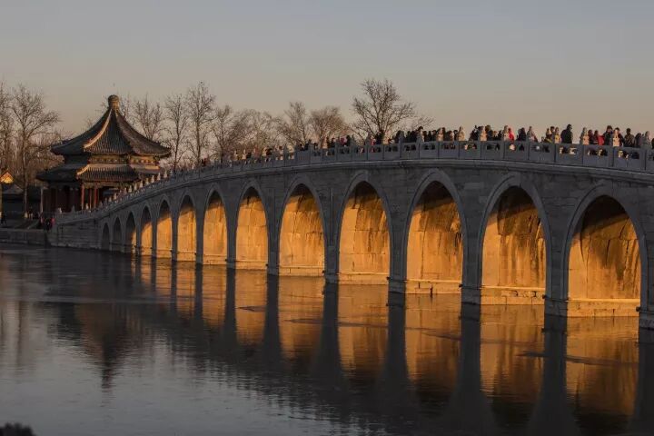 △“金光穿洞”是颐和园十七孔桥每年难得一见的绚烂景象:落日余晖照亮桥洞侧壁,远远看去就像桥洞内点满了明灯,金光灿灿的光辉映满桥洞。