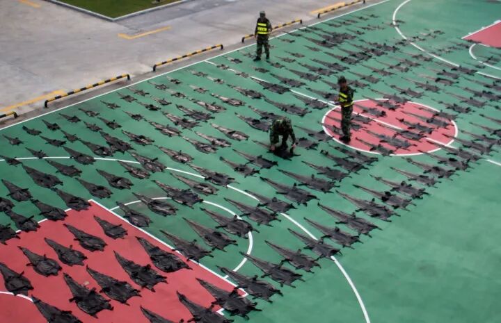△图为鳄鱼皮摆满篮球场。10月8日,广西边防查获大量非法运输的暹罗鳄表皮,共215张,最长的接近两米,最短的仅40多公分。