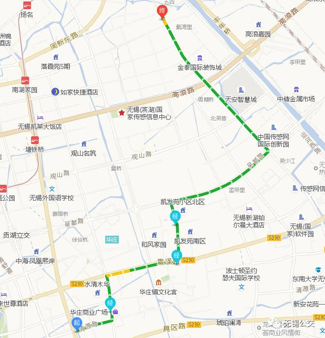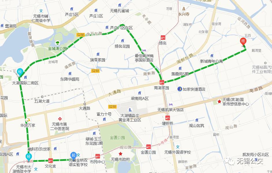 由观山路(南湖大道)始发,经南湖大道、高运路、华清大道、大通路、菱湖大道到苏南水产城(全程约10公里)。