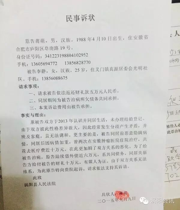 婚后定居合肥 由于公婆生意比较忙  我便听从老公的话没有选择继续工作,而是选择在家给他和公婆洗衣做饭打理日常家务,做起了全职太太。虽然谈不上温柔贤惠,但最起码是像我父母说的那样把公婆当成亲生父母一样看待。婚后不久一次帮助婆婆卸运20包80斤的麦麸包时吐了血(公婆做粮食收售),当时没在意,觉得可能是卸货过于劳累所致。举办婚礼生活半年后,本来去领取结婚证,由于2014年2月份一次剧烈头晕去医院初步检查结果显示血小板偏低,公公得知化验结果后,就立即打电话告诉老公蒋萌不要让他跟我领结婚证,他还故意把户口本藏了起来,强行阻止我们补办结婚证。