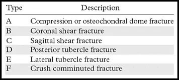 II型大多是骨折手术复位治疗。 最近的研究表明骨折位移,粉碎程度,软组织损伤的程度和手术复位的质量影响骨坏死的发展和总体结果(21,22) 在III型和IV型骨折中,可能最初尝试在急诊部门进行封闭复位以减轻皮肤紧张和最小化软组织损伤。 最终治疗是开放性还原和内固定(23)。