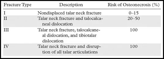 孤立的距骨颈骨折不延伸到距下,距舟,或胫距关节。 然而,在Dale等人(9)最近的一项研究中,大部分的距骨颈骨折从距骨体或头部延伸。 霍金斯(14)最初描述了1970年的颈部骨折分类系统,随后在1978年被Canale和Kelly(19)修改。如果识别出通过颈部的垂直分量,则可以应用修改的Hawkins-Canale分类 表格(1)。