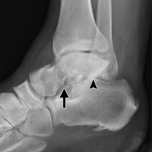 图6a Hawkins-Canale II型距骨颈骨折。 踝部的侧面放射照片(a)和矢状CT图像(b)显示了距骨后颈(a的箭头)和后部距下小平面(箭头)的脱位的垂直骨折。