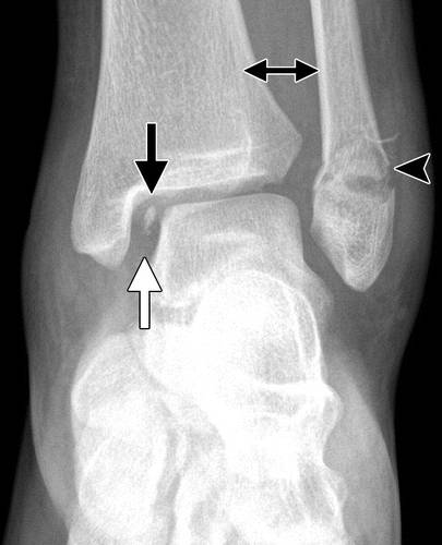 图12a内侧踝关节骨软骨骨折。 AP(a)和斜位(b)踝骨的X线照片显示椎间融合器的移位骨软骨骨折(黑色箭头)。 还注意到倾斜的骨干腓骨骨折(箭头),syndesmotic加宽(双头箭头)和内侧清晰空间加宽(白色箭头b),符合syndesmotic和三角肌韧带复杂损伤的存在。