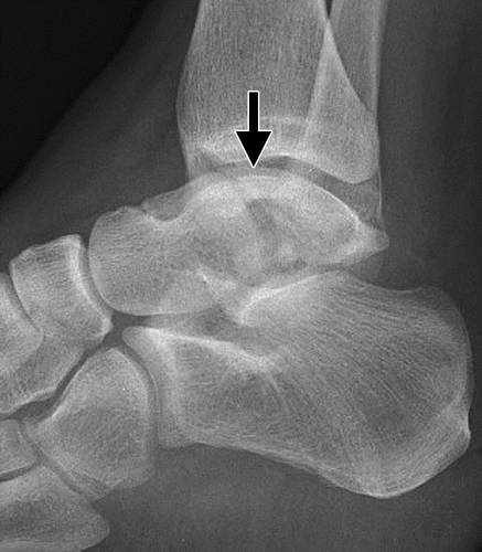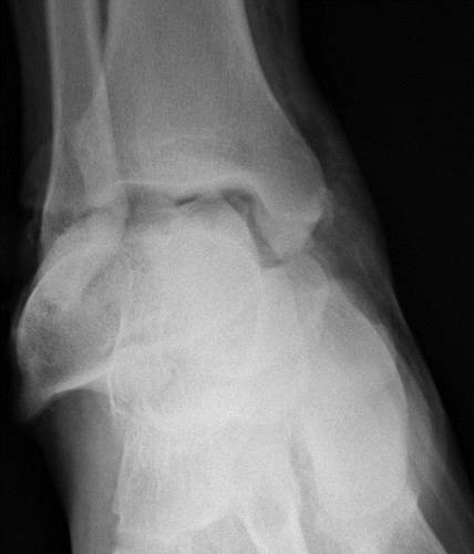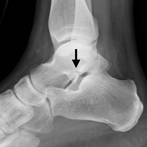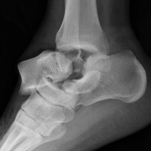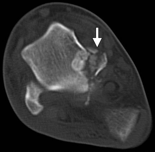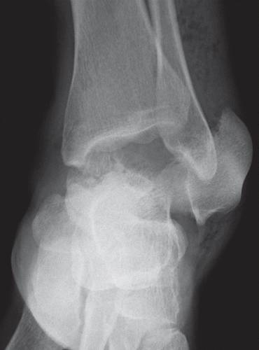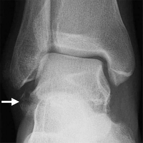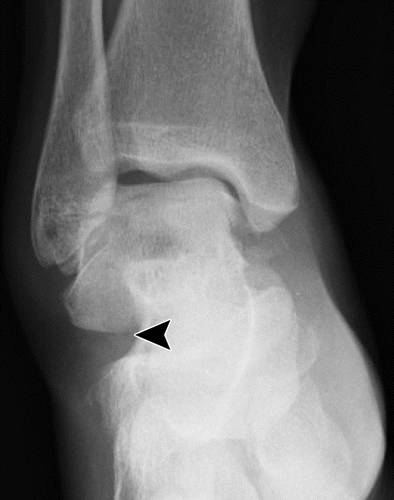 距骨的侧面形成后距下关节面的前外侧部分。 其侧面与腓骨的尖端铰接。 骨折的侧向显示最好AP脚踝射线照片。 这种类型的骨折还可以被看作是横突的皮层的中断,因为侧向过程通常与距骨圆顶的外侧方面邻接。 外侧突骨折常常在初始X光片上漏诊(33)。 CT常常需要检测和了解损伤的程度(34)。