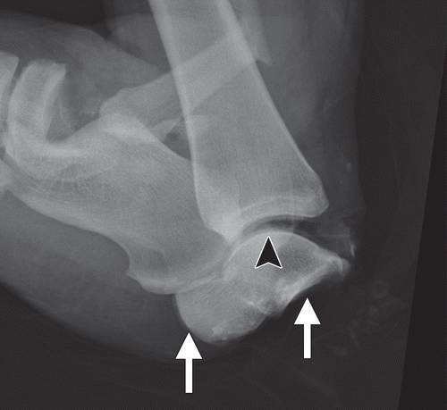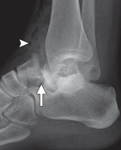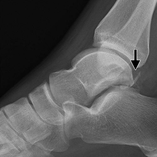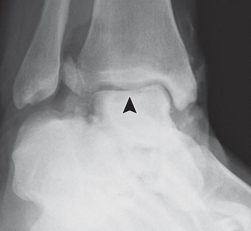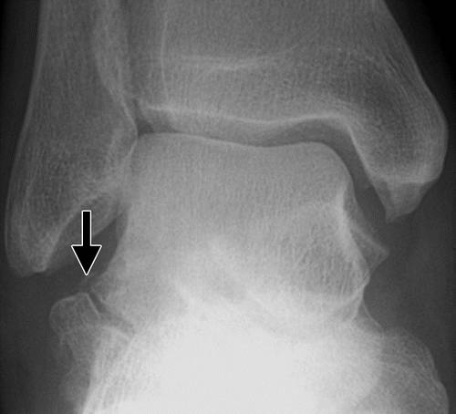 图14 三角骨。 踝部的侧面X线片显示在距骨后方的椭圆形皮质骨化(箭头)。