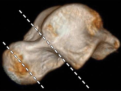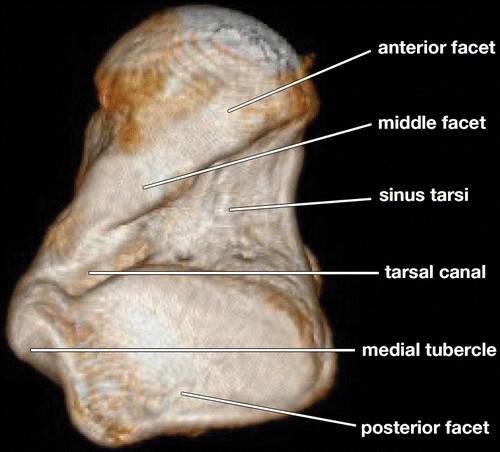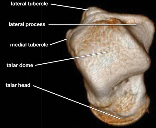 图1a距骨的正常解剖。 三维重建计算断层(CT)图像显示在上(a)和下(b)投影中的距骨及其关键部件。