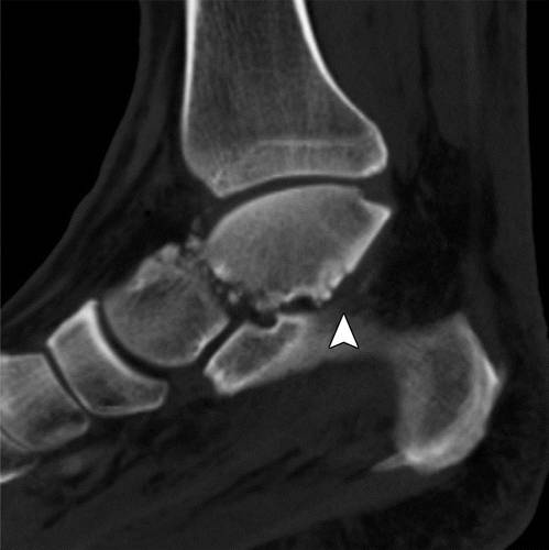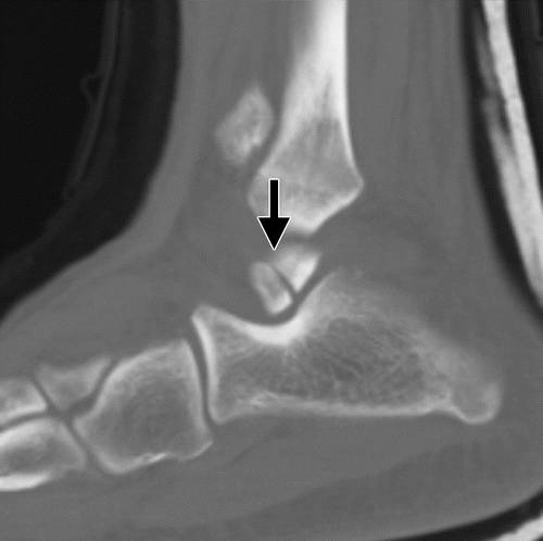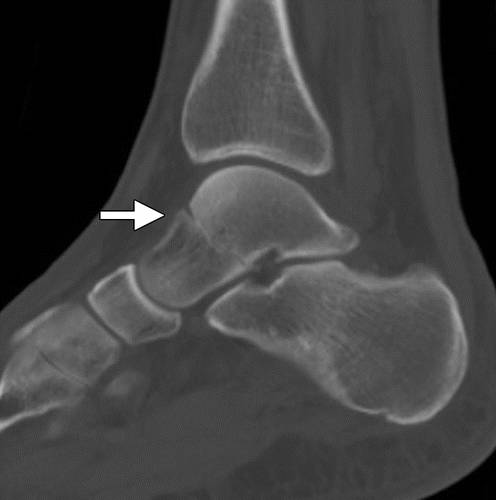 图5 Hawkins-Canale I型距骨颈骨折。 踝关节的矢状CT图像显示通过距骨颈的非置换骨折(箭头)。 注意,骨折前面的后下方小关节面的下延伸,限定了距骨颈部位置。