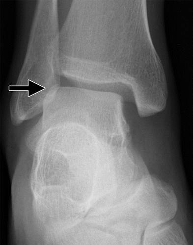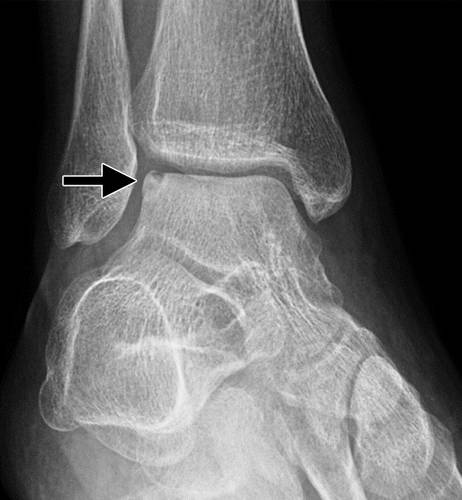 图11b外侧距骨软骨骨折。 (a)踝关节的AP射线照片显示外侧的距骨穹顶(箭头)的微妙的骨软骨骨折,被重叠的腓骨遮蔽。 (b)脚踝的斜位视图更好地显示骨折(箭头)。