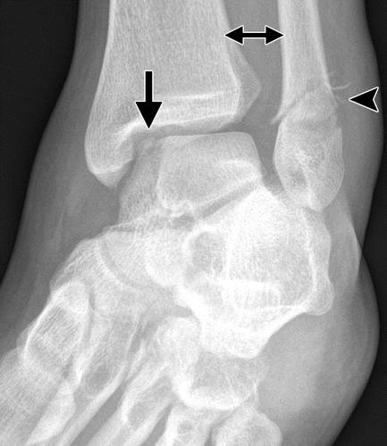横突骨折(Lateral process fractures)经常初始在X光片隐匿,并且通常存在于在脚的被迫背屈和反转损伤后围绕踝的外侧的持续性疼痛(33)