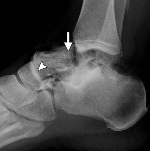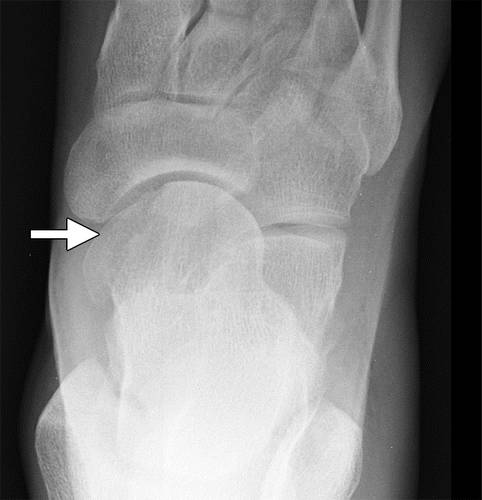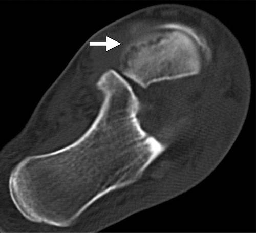 图3a距骨骨小头骨折。 足部的AP射线照片(a)和斜轴重新格式化的CT图像(b)显示了距骨头部(箭头)的微小位移剪切断裂。