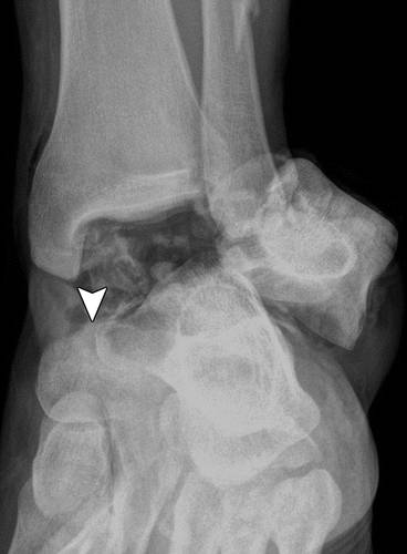 X光片显示骨折片段在后及内侧距骨,是诊断后Cedell内侧结节骨折的一个依据。 所提出的机制是在后胫骨韧带与踝关节的背侧附着的背屈和旋前的撕脱(30)。