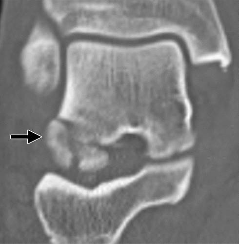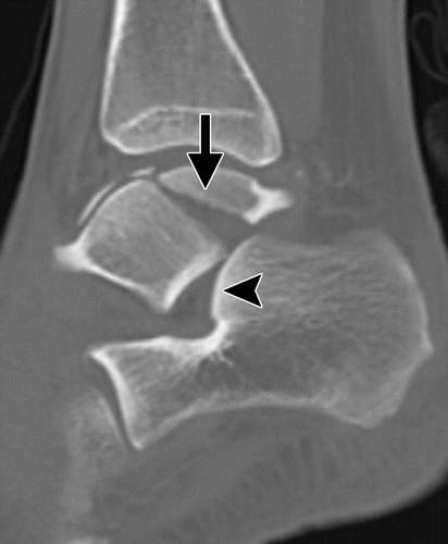 图9矢状切骨距骨折。 冠状的踝关节的CT图像显示在矢状平面中的距骨体的断裂。 骨折碎片在距骨顶关节面(箭头)有轻微的垂直偏移。