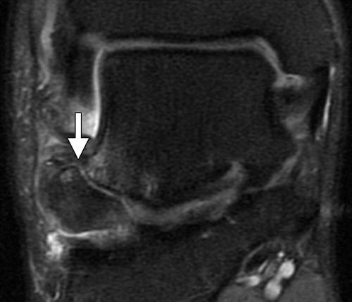 图18a距骨横突骨折的不愈合。 (a)踝的AP射线照片显示侧向过程的皮质骨折片段(箭头),与不连续的横突骨折(霍金斯I型)一致。 (b)踝的冠状质子密度加权的脂肪饱和MRI图像显示了横突的大的皮质片段,与非骨质断裂一致。 皮下水肿和囊肿存在于假关节(箭头)。