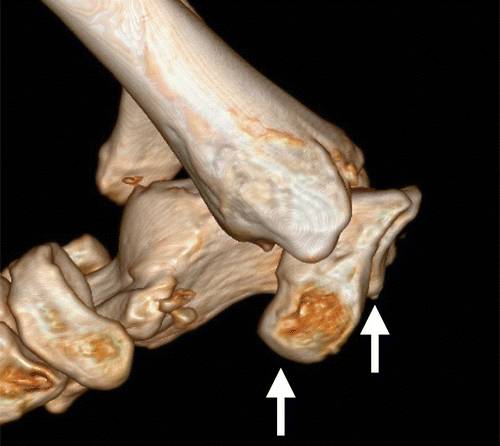 大多数距下位错伴有后足骨折,包括骨软骨骨折,跟骨骨折,后路过程骨折和距骨结节。 关节内骨软骨骨折是特别常见的,发生在所有距骨脱臼的50%-71%和高达100%的侧位错(47),其中大多数涉及距下关节(46)。 这些骨折在内侧脱臼中较少见,仅发生在12%-38%的损伤中(47)。 相关的关节内骨折难以在普通放射照相术中识别,并且它们的存在可以阻碍解剖减少并恶化总体预后。 因此,建议常规检查后,CT检查更准确地检测这些骨折。