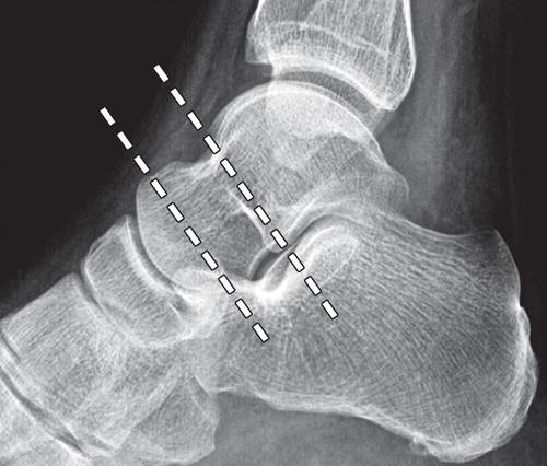 图4b距骨颈部的边界。 距骨的三维重建的CT图像(a)和外侧踝部的X射线照片(b)示出了距骨头,颈部和身体之间的分割(虚线)。 距骨体部骨折是由位于侧向进程中或后一个下骨折线定义。