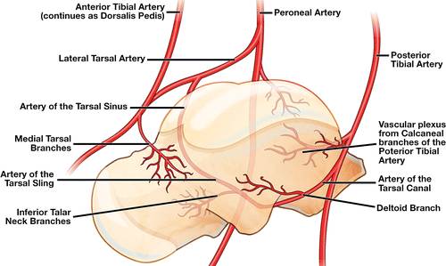 距骨颈和头部的超内半部由前胫动脉的分支提供。 该下侧壁一半可能由跗骨窦动脉或跗骨窦动脉吻合分支和跗管动脉供给,或从横向跗动脉,其来自足背动脉(7)。