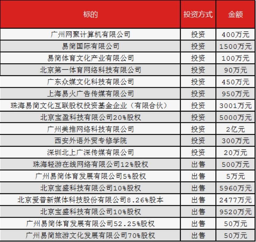值得一提的是,胡衍军选择投资的公司大都与新媒体相关。而易简集团正是通过这样不停地投资和出售资产,获得了可观的净利润。