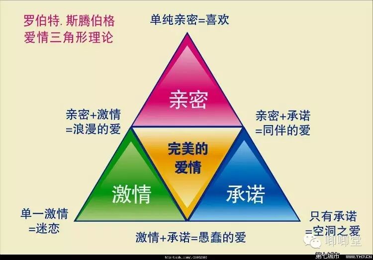 激情是爱情中的性欲成分,是情绪上的着迷;亲密是指在爱情关系中能够引起的温暖体验;承诺指维持关系的决定期许或担保。完美的爱情包扩这三个方面,失败的爱情则一无所有。