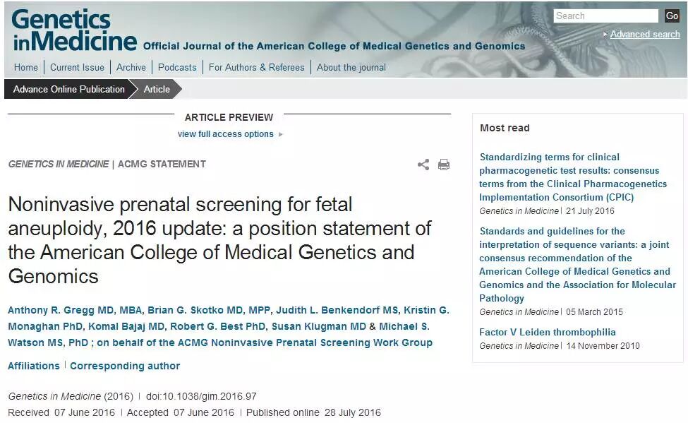 ACMG 作为美国唯一一个以遗传和基因组学为专长的国家级医学学会,其立场申明对基因检测在全美的临床应用具有重要的指导意义。近几年来,ACMG已经对个人基因检测、临床基因服务、无创产前基因检测等临床应用发表了立场声明。而近日,ACMG率先声明了NIPT能够代替传统筛查方法的临床定位,相信此次立场声明,能够为NIPT的临床实践提供更多的有益参考。