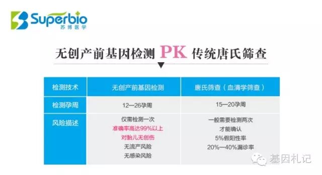 另外,取绒毛、羊水或者脐带血做 胎儿染色体都是一种侵入性产前诊断,对胎儿和孕妇有一定的风险,且对医生的技术要求相对高。相对于这种有创,无创产前基因检测,只需要采集孕妇外周血(5ml-10ml),提取游离DNA,采用新一代高通量测序技术,结合生物信息分析,得出胎儿患染色体非整倍体(21-三体又称唐氏综合征,18-三体,13-三体)的风险。该方法最佳检测时间为孕早、中期,具有无创取样、无流产风险、高灵敏度,准确性高的特点。