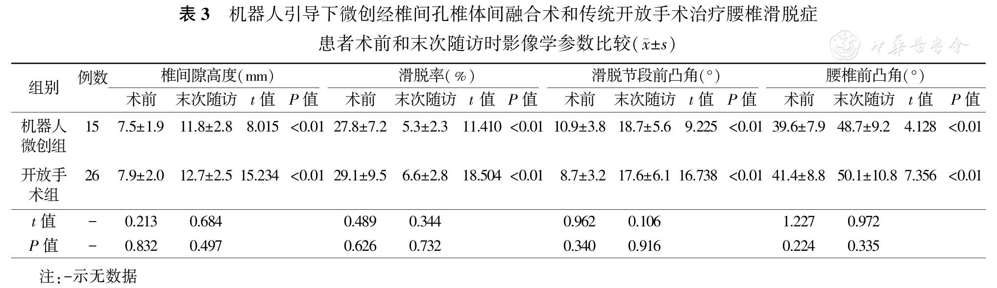 与术前相比,机器人微创组和开放手术组末次随访时椎间隙高度、腰椎前凸角、滑脱节段前凸角均增大(t=4.128~16.738,P值均<0.01),滑脱率减小(t=11.410、18.504,P值均<0.01),但是两组间差异无统计学意义(t=0.106~1.227,P值均>0.05)(表3)。与术前相比,术后机器人微创组患者的椎旁肌无明显萎缩,而开放手术组患者的椎旁肌出现了明显萎缩。![]()