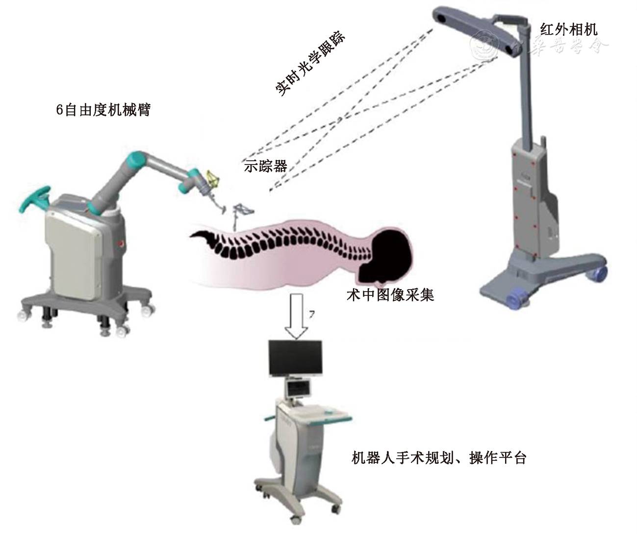 机器人有抗疲劳、精确度高的优势,在普外科、神经外科、心外科、泌尿外科和骨科中的应用逐渐增加,取得了良好的临床效果[8,9]。骨科应用的包括以色列Renaissance机器人引导系统、美国达芬奇机器人系统等。Renaissance机器人是Mazor技术公司在其第一代SpineAssist机器人基础上发展而来,其优点是和影像学资料相结合,指导术中操作;缺点是获取术前CT时的体位和术中体位可能不一致,不同骨性结构的相对位置会发生变化,导致误差增加。达芬奇机器人是和内窥镜结合的手术控制系统,可以进行精细、安全的操作,但不能和影像相结合,故在骨科应用相对较少,主要应用于腰椎前路融合术中神经和血管的分离及脊柱感染的清理[10,11]。