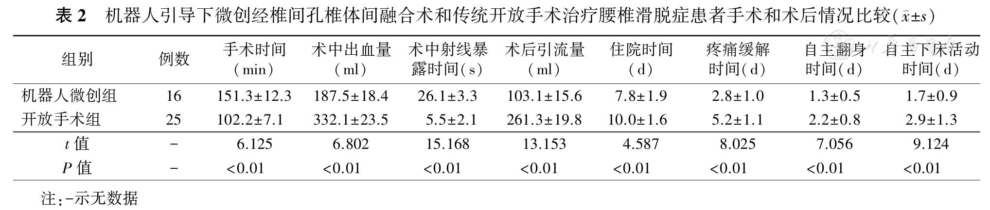 纳入标准:(1)单节段Meyerding Ⅰ、Ⅱ度腰椎滑脱;(2)腰痛或下肢疼痛持续超过6个月,疼痛视觉模拟评分(visual analog scale,VAS)>5分;(3)经系统的规范化保守治疗无效。排除标准:(1)既往曾行腰椎手术者;(2)腰椎感染、肿瘤、相邻节段不稳定者;(3)伴有脊柱侧凸者。共41例患者符合纳入排除标准,其中机器人微创组16例,男性1例,女性15例,年龄35~68岁,平均52.5岁;L4~5节段滑脱10例,L5~S1节段滑脱6例,伴有峡部裂5例;临床表现为腰痛4例,腰痛伴下肢疼痛麻木12例;根据Meyerding分度标准[4],Ⅰ度滑脱9例,Ⅱ度滑脱7例。开放手术组25例,男性6例,女性19例,年龄39~72岁,平均54.1岁;L4~5节段滑脱15例,L5~S1节段滑脱10例,伴有峡部裂9例;临床表现为腰痛7例,腰痛伴下肢疼痛麻木18例;Ⅰ度滑脱14例,Ⅱ度滑脱11例。