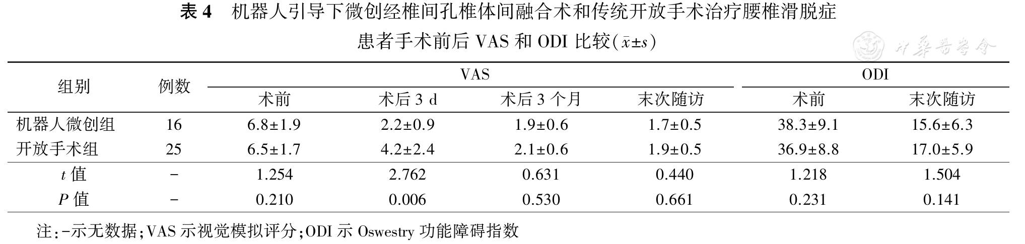 多裂肌主要参与背伸运动、维持脊柱腰段前凸,是脊柱动力性稳定的重要因素,其功能受到损害之后是其他肌群无法代替的[17]。机器人引导下微创TLIF手术增加对多裂肌的保护,减少了对脊柱稳定性的干扰,降低邻近节段退变的发生率,也为术后早期活动创造条件[18]。机器人微创组患者的术中出血量和术后引流量均显著少于开放手术组,术后MRI显示机器人微创组患者的椎旁肌和术前相比无明显萎缩,而开放手术组患者的椎旁肌则出现较明显的萎缩。机器人微创组和开放手术组的术后腰痛、ODI均较术前改善,但是在术后3 d机器人微创组的腰痛VAS评分显著低于开放手术组,疼痛缓解时间、自主翻身时间、自主下床活动时间也显著少于开放手术组,体现了机器人引导下微创TLIF手术创伤小、患者疼痛轻、恢复快的特点。