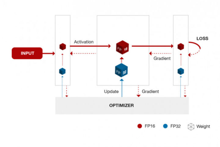 据了解,大多数的深度学习模型使用的是32位单精度浮点数(FP32)来进行训练,而混合精度训练的方法则通过16位浮点数(FP16)进行深度学习模型训练,从而减少了训练深度学习模型所需的内存,同时由于FP16的运算比FP32运算更快,从而也进一步提高了硬件效率。