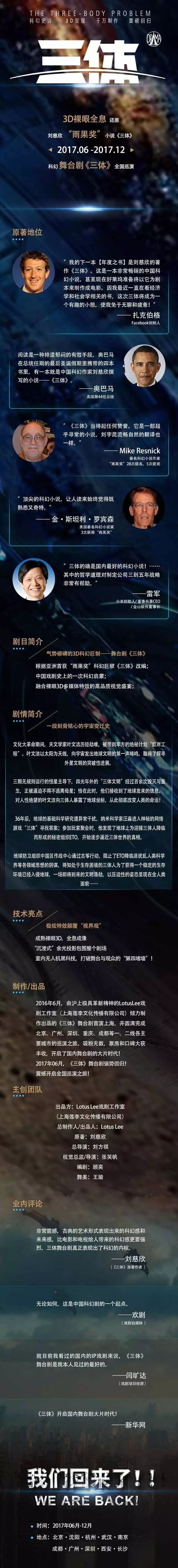 3D多媒体舞台剧《三体》由小说原作者刘慈欣亲自坐镇监制,严格保证了思想立场和美学诠释的准确性。刘慈欣,中国科幻小说届首屈一指的人物,代表作《超新星纪元》、《球状闪电》、《三体》三部曲等,都是科幻迷们疯狂追捧热读的作品。《三体》三部曲被认为是中国科幻文学的里程碑之作,问鼎全球大奖“雨果奖”。