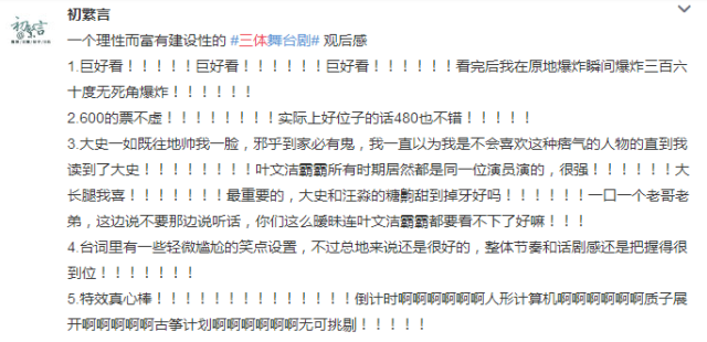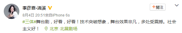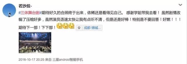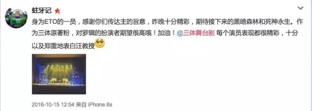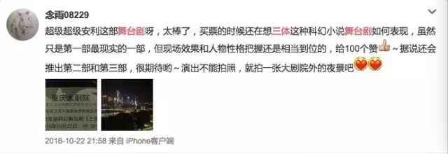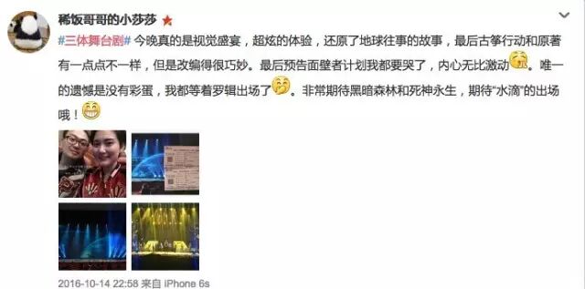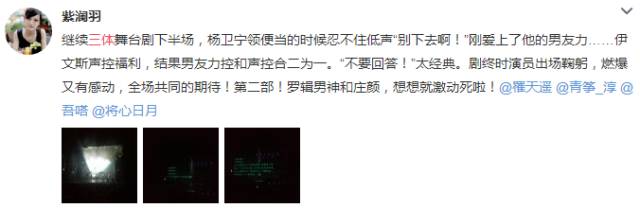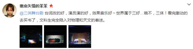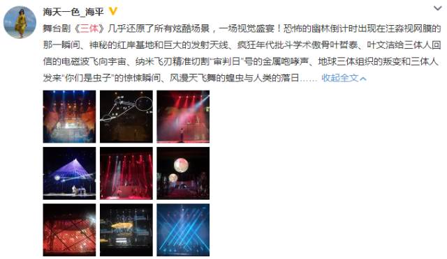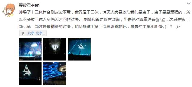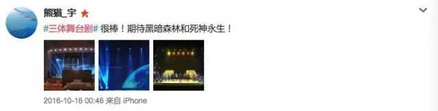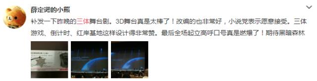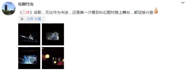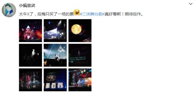 非常震撼,古典的艺术形式表现出来的科幻感和未来感,比电影和电视给人带来的科幻感更要强烈,三体舞台剧真正表现出了科技的内核。