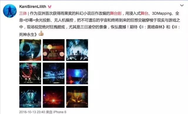 《三体》舞台剧在高度还原小说原著的基础上,更是将舞台剧与黑科技的完美结合,在舞台剧制作方面结合3D Mapping、纱幕成像、视听特效、虚拟现实元素、无人机等前沿酷炫黑科技为主的幻觉设计,超一流的视听效果,几近完美的舞美设计,彻底颠覆了传统舞台剧。