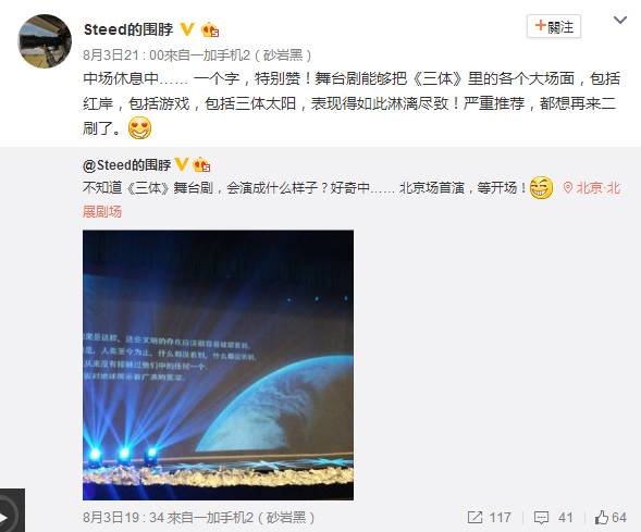 几张剧照让我们回到最初的感动12月22日、23日北京展览馆剧场大型科幻舞台剧《三体》2017年度收官场约你见面感谢各位三体迷感谢所有到场观看过舞台剧的观众对于《三体》舞台剧一直以来的支持和厚爱山水有相逢,我们有缘再见