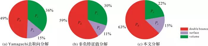 为了定量验证本文分解的有效性,截取了图中矩形所标注的一小块城区以作试验,该区域主导散射为来自建筑物墙壁与地表构成的偶次散射,非主导散射为来自地表或屋顶的面散射以及来自市区树木的体散射。图 3显示了3种分解下的面散射、偶次散射和体散射的功率比例饼图对比。从图 3可看到,体散射功率比例从NNED中的30%降至本文分解中的22%,可知本文分解较NNED进一步抑制了城区的体散射功率,解决了NNED中体散射仍被过高估计的问题。同时可看到,该区域偶次散射比例从NNED中的59%升至本文分解中的63%,符合该区域的实际散射特征。