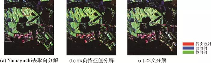图 5显示了图 4中的左下方矩形区域的分解结果放大图。该区域为旋转的建筑物区,从本文结果中可以更直观地看到更多的像素显示为红色即二次散射占主导,因此对于实际地物散射特征的提取更为充分。