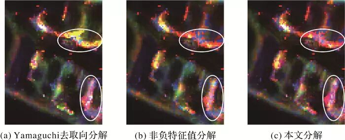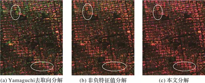 图 1显示了3种不同分解方法下的RGB合成结果的对比。可以很明显地看到,3幅图像从左到右体散射分量剧烈减弱,如图中左侧的红色椭圆所标注区域所示,即在RGB合成结果中绿色成分明显减弱;同时,城区偶次散射份量显著增强,比较典型的如图中右侧的白色椭圆标注的区域所示。在3幅图像中,本文的分解对于偶次散射成分的提取相比于其他两个分解更为充分,符合该区域的实际散射特征。