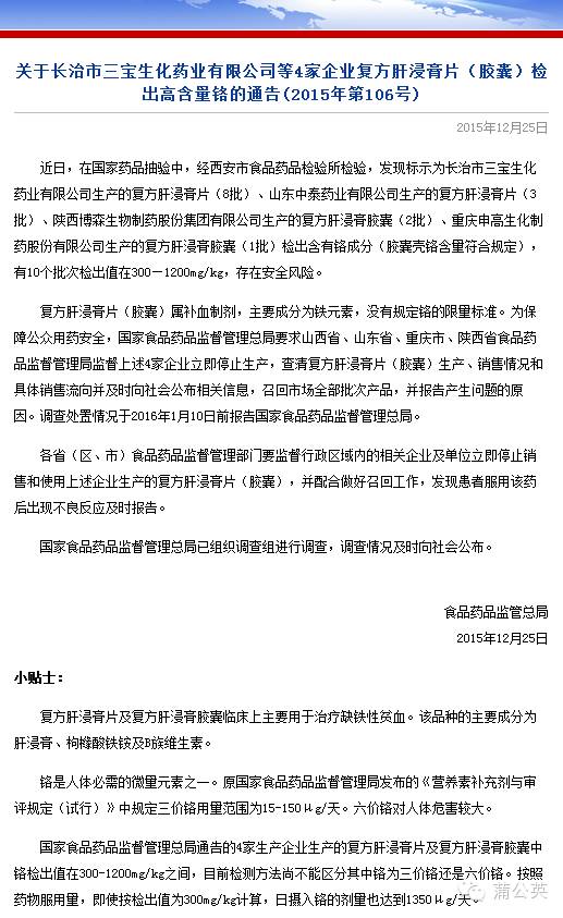 CFDA官网于12月25日公布了4家药企10个批次的复方肝浸膏片(胶囊)检出高含量铬300—1200mg/kg,要求企业立即停产和召回。从通知上看,这次铬含量超标与上次“毒胶囊”事情本质完全不同,首次这次涉及药品CFDA特别强调“胶囊壳铬含量合格”; 而上次毒胶囊罪魁祸首为空心胶囊。