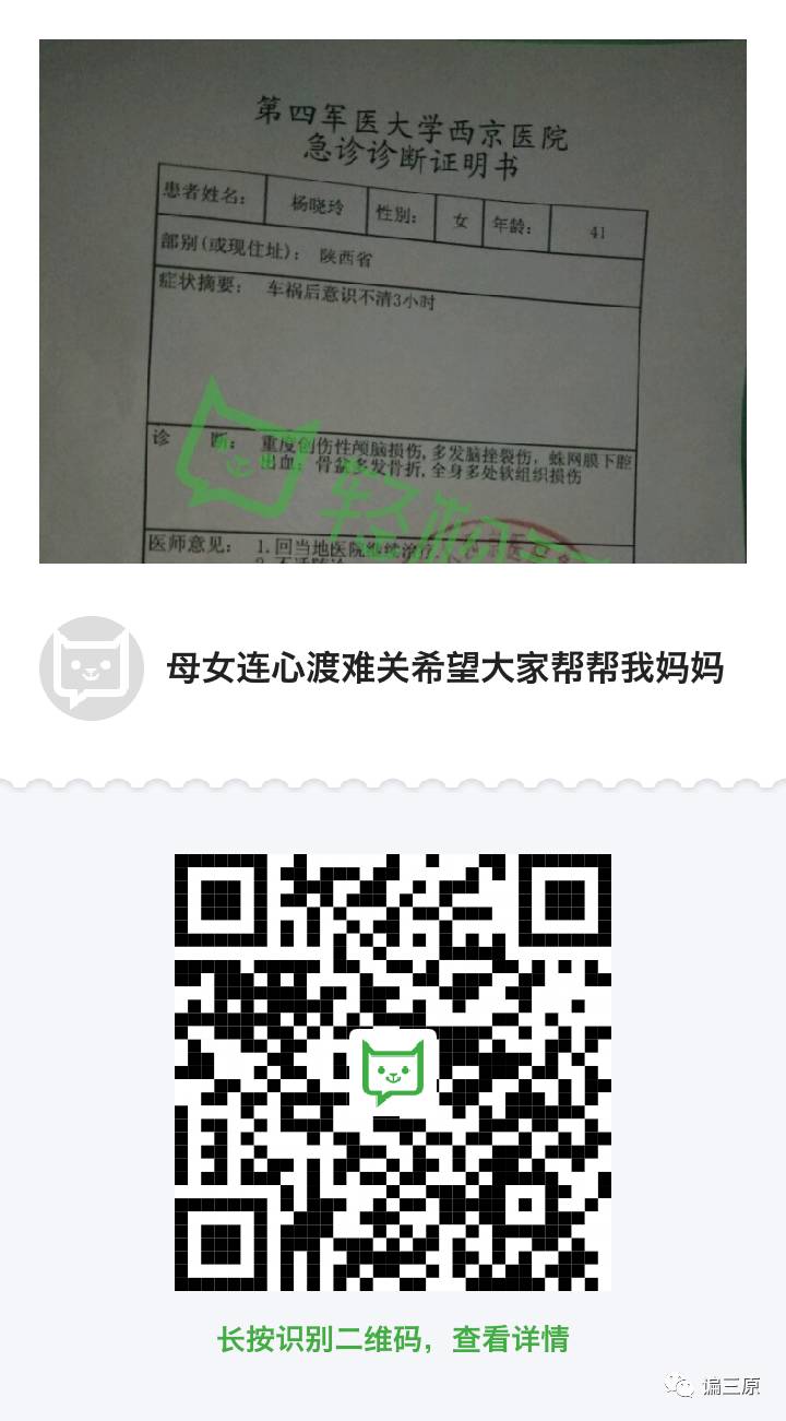 网友@大吉:这是轻松筹的链接,里面车祸的受害者是我的小妈,10月21日出事至今,仅仅医院治疗所花的费用就二十多万,而肇事司机家只给了不到四万元,之后就以家里没钱为借口,再无音讯,而后续治疗还遥遥无期,家里实在是负担不起了,无奈之下才选择了众筹这条道路,希望谝三原的编辑能够在你们的平台上呼吁更多有爱心的人士,帮助一下这个风雨中摇曳的家庭,帮帮这个至今还躺在床上的妈妈,帮助这个孩子能够继续完成学业。
