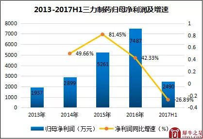 2013-2016年,公司的归母净利润年均复合增速亦达到56.94%。2017上半年,三力制药实现归母净利润2490万元,同比下降26.89%。同比下降的原因为2016年上半年有某项技术转让所得1160万元,而2017年并没有该项收入。