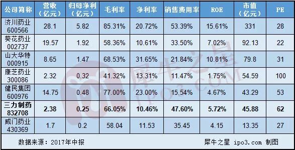 与上市公司相比,三力制药的收入和利润规模仍略小,不过其估值水平却已超过A股同行企业。
